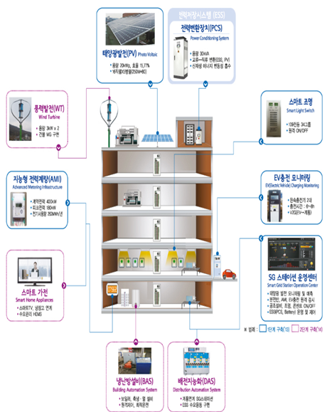 한전 사옥에 설치된 스마트그리드 스테이션은 태양광, ESS, 스마트콘센트, 스마트 배전반, 전기차 충전시스템, 전체 시스템을 총괄하는 제어센터 등으로 구성되어 있으며, 전력피크 감축, 에너지 절약 등 건물 내부의 전체 에너지에 대한 효율적인 관리가 가능하고, 두바이 스마트시티 구축의 기본 모델로 적용된다.