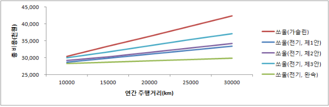 이에 더해, 연간 주행거리가 늘어날수록 전기차의 총 비용은 낮아져 연간 3만km씩 5년을 운행할 경우에는 제1안의 총 비용은 3,338만3,000원으로 동급 내연기관 자동차의 총 비용인 4,232만1,000원에 비해 894만원, 제3안의 경우는 3,717만6,000원으로 내연기관 차량에 비해 515만원이 저렴하게 된다.