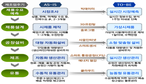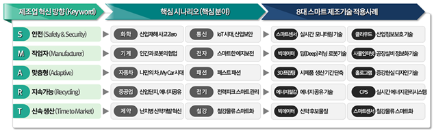 정부는 국내 제조업의 혁신을 위해 전기, 전자, 자동차, 기계 및 중공업, 철강, 통신, 패션, 제약 및 화학 등 8대 업종을 대상으로 스마트센서, CPS, 3D프린팅, 에너지절감, 사물인터넷, 클라우드, 빅데이터, 홀로그램 등의 8대 기술을 융합하는 ‘스마트제조R&D 중장기 로드맵’을 발표하고, 앞으로 5년간 4,161억원을 투자하기로 했다.