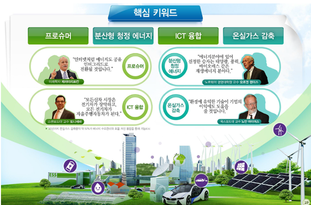 ‘2030 에너지신산업 확산전략’을 살펴보면, 정부는 미래 에너지는 앞서 언급되었던 ‘프로슈머’, ‘분산형 청정에너지’, ‘ICT 융합’, ‘온실가스 감축’ 등 4가지 트렌드를 통해 새로운 사회가 전망되고 있어 이를 선제적으로 대비하는 에너지신산업의 정책 방향을 설정하고, 전력, 수송, 산업 등 사회 전 분야의 에너지신산업 과제를 도출했다고 밝혔다.