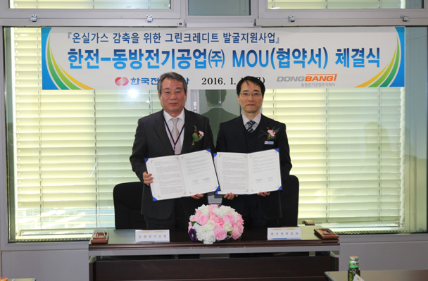 한전은 지난 1월 14일 나주 본사에서 한전 김홍균 기술기획처장, 동방전기공업(주) 양태권 사장 등이 참석한 가운데, 중소기업과 온실가스 감축을 추진하기로 하고, ‘그린크레디트 발굴지원사업’을 위한 MOU를 체결했다.