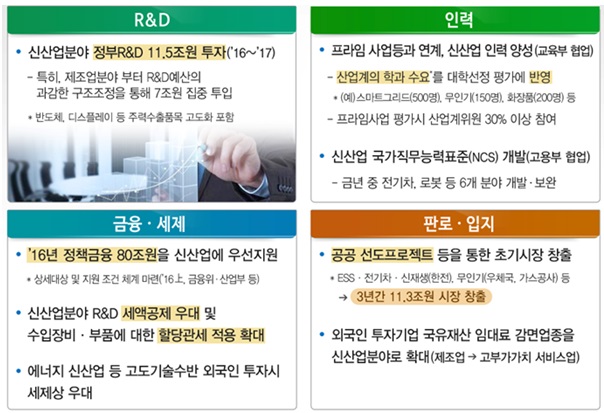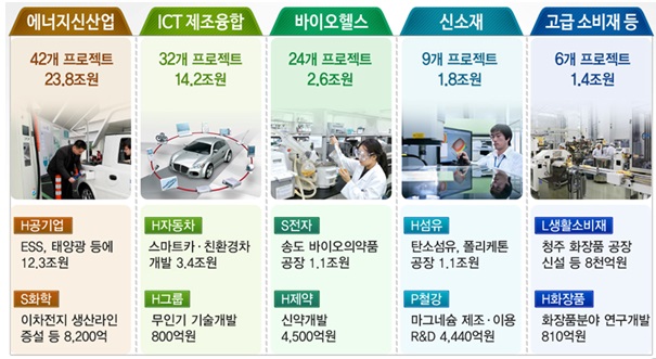 정부가 선정한 5대 신산업은 에너지신산업, 신소재, 고급소비재, 바이오 헬스, ICT 제조 융합이며, 이에 대해 정부는 민간의 신산업 투자 촉진을 위해 총괄적인 지원 방안을 마련하고 있다.