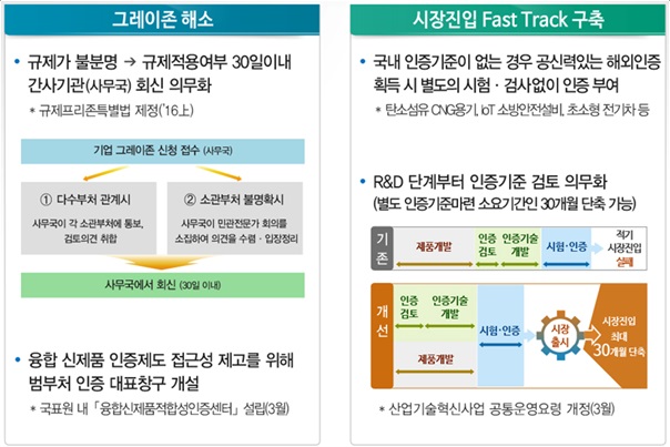 두 번째는 종전에 융합 제품을 출시할 경우, 이중적인 규제로 제품화가 늦어지고, 심지어는 상품화에 실패하는 사례가 있었는데, 이번에는 정부 주무부처가 규제 내용을 사전에 확인해주는 ‘규제 그레이존 해소’ 제도를 도입하고, 융합 신제품이 신속히 출시되도록 패스트 트랙을 구축하게 된다.