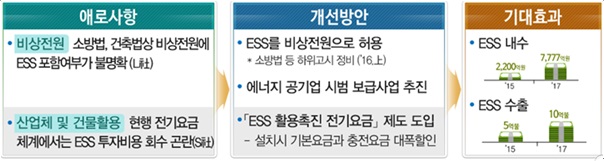 ESS에 대해서는 비상전원으로 사용할 수 있도록 올해 상반기에 관련 제도를 개선하기로 했다. 또한, ESS는 투자비 회수 기간이 길어 공장, 상가 등이 ESS를 사용해 전기소비를 줄이면 요금 할인 혜택을 주기로 했다. 예를 들어, 1MW급 ESS 기준으로 이를 시행하면, 연간 1억4천만원의 전기요금이 절감돼 투자비 회수기간가 현재 9.4년에서 5.9년으로 단축될 것으로 예상된다. 이와 함께 에너지공기업에서 ESS를 시범 보급사업을 추진하게 된다.
