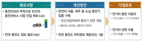 전기차는 한전이 서울, 제주 등에 충전기를 구축해 민간사업자에 충전기를 전면 개방하고, 올해 7월에는 한전이 전국의 전기차 충전소 위치 정보를 제공하게 된다. 이에 따라 전기차 충전 사업자는 작년에 3개에 불과했으나 2017년에는 50개로 확대되고, 전기차 실증에 따라 2017년에 39억달러의 수출을 기대하고 있다.