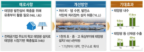 태양광발전에 대해서는 올해에 저수지, 댐수면, 발전소 석탄재 처리장 등 유휴 부지를 활용할 수 있도록 하고, 전국 1천개 초중고교 옥상 부지에도 태양광 발전을 설치하며, 내년에는 대학 및 연구소 옥상으로 확대하기로 했다.