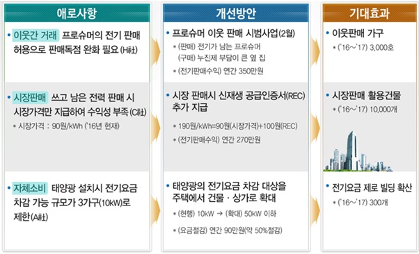 이에 따라, 건물에 설치된 태양광발 등에서 남는 전기를 전력시장에 판매할 경우에 시장가격 외에 신재생공급인증서(REC)까지 부여해 수익을 두 배 이상 확보할 수 있도록 했다. 예를 들어, 개선안이 시행되면, 전기를 판매한 시장가격 90원/kWh 외에 REC로 190원/kWh의 추가 수익을 얻을 수 있게 된다.