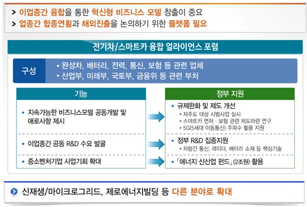 이에 따라 에너지신산업에 다른 업종이 참여해 융합적인 상품과 비즈니스 모델을 만들게 된다. 예를 들어, 전기차와 스마트카에는 완성차, 배터리, 통신, IT, 보험 업계 등이 참여하고, 제로에너지빌딩에는 고효율기기, 신재생, 건축설계, 건설 업계 등이 참여한다. 이를 통해 타 업종 간의 공동 비즈니스 개발, 미션이노베이션 기술개발, 중소 및 벤처 기업의 사업 기회 확대 등이 추진된다.