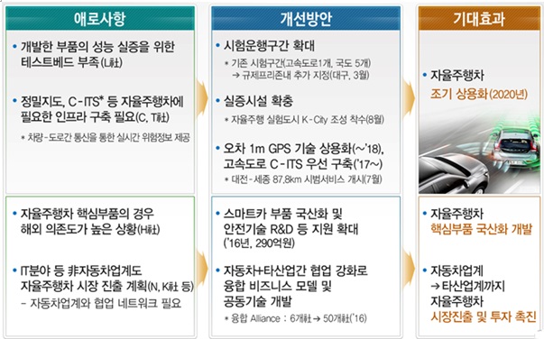 또한, 자율주행차 개발 지원을 위해 시험구간 및 실증시설 확충, 정밀도로지도 등 지원인프라 확대와 안전기준 연구가 추진된다. 이외에도 IoT 신산업 주파수 100MHz폭 이상을 추가 공급해 스마트홈, 원격검침 등 다양한 IoT 사업이 확대될 수 있도록 지원된다.