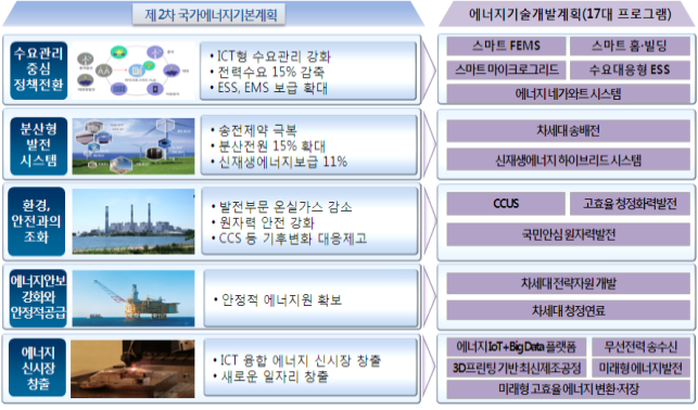 이번 계획의 주요 내용으로는, 우선 정책지원 분야에서 제2차 국가에너지기본계획을 실현할 기술 기반을 마련하도록 되어 있다. 구체적인 목표로는 ▲ 전력수요 15% 감축, ▲ 분산전원 15% 확대, ▲ 신재생에너지 보급 11%, ▲ 발전부문 온실가스 감축 등을 명시해 종전보다 목표치가 약간 상향 조정됐다.