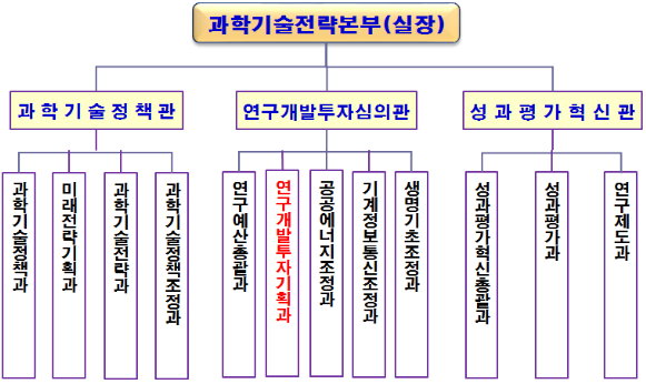 과학기술전략본부는 본부장 산하에 과학기술정책관, 연구개발투자심의관, 성과평가혁신관 등과 함께 연구개발투자기획과 등 12개과로 구성됐다. 앞으로 과학기술전략본부는 실질적으로 정부 R&D의 전략부터 평가까지 모든 상위 프로세스를 총괄해 운영하는 강력한 조직으로 탄생해 향후 국가 R&D를 주도적으로 이끌게 될 전망이다.